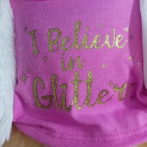 Build-A-Bear rainbow (pink red orange yellow geen blue purple) full outfit gold sparkly skirt T-shirt and white fluffy vest T-shirt says " I believe in glitter"
