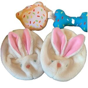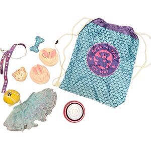 Build-A-Bear BAB Mixed Lot of 11 items-most are in like new condition: Backpack, pink and purple collar & leash, bunny slippers (pair), plush bone, plush ball, plush treat, blue sparkly tutu, pink bowl with reversible water/food insert.