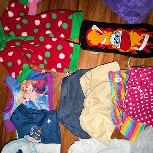 Assorted build a bear clothing and accessories. Includes tutus, skirts, tops, pajamas and slippers. Bright multi-color pieces with holiday polka-dot sweater and purple tutu. Great mix for dress-up and everyday play.