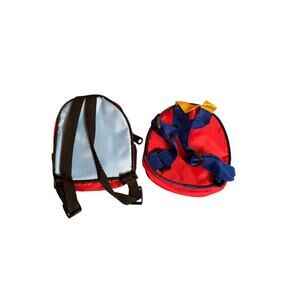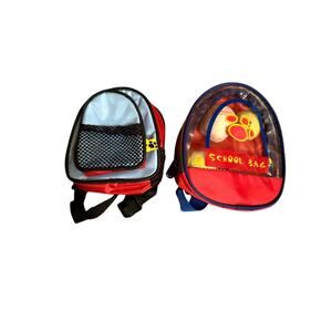 • Red school backpack with a clear window showing a toy balls inside.