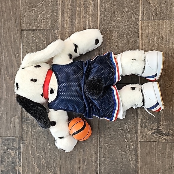 Cute Dalmatian with Floppy Ears, Red Collar, Attached Basketball, Basketball Mesh Shorts and Shirt, and Matching Striped Tennis Shoes.