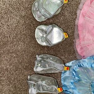 this dress bundle features a Cinderella dress, a tangled inspired dress and a butterfly dress. It also comes with two different pairs of glass slippers. One pair has an open toe and one pair does not.