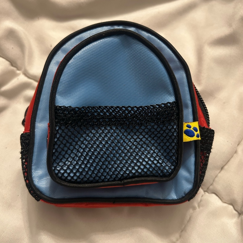 Super cute mini backpack made for Build-A-Bear plush! This tiny backpack features a bright red exterior with a light blue front panel and black trim. It includes a zippered main compartment, a front mesh pocket, and mesh side pouches perfect for holding a tiny water bottle or accessories. Adjustable shoulder straps make it easy to put on your bear for play or display.
