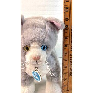 Soft and huggable plush cat with unique two-tone eyes and a gray and white fur pattern. Crafted for cuddling or display.