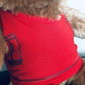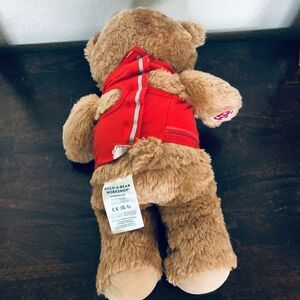 Build-A-Bear stuffed plush teddy bear animal in great preowned condition. Clean, nonsmoking home. Red shirt has some pilling as shown, can be removed or replaced.
