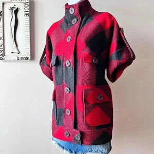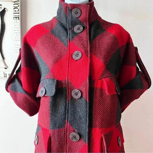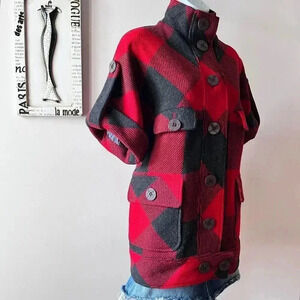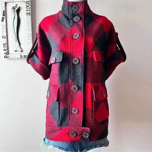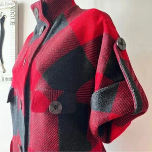 Built By Wendy Preppy Plaid Red Gray Button Cape Coat Size XS