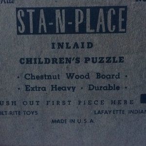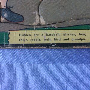 -Made in USA. 12x9. Puzzle pieces and board in good shape, but appearance is worn and puzzle board is colored underneath the pieces. 8 items are hidden in the picture. Several puzzle pieces are recognizable shapes: key, football, bottle.