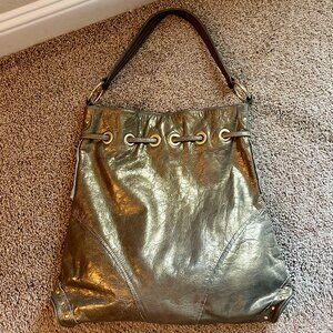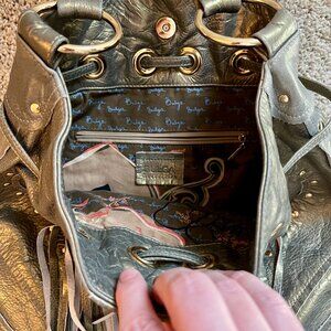 Bulga Leather Studded Hobo Tote Bag in Iridescent Green