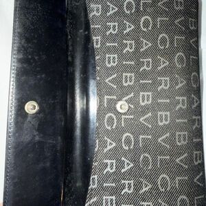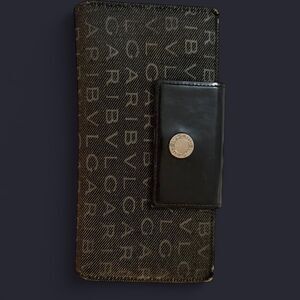 Classic Bvlgari black canvas and leather wallet featuring the iconic BVLGARI monogram pattern and metal logo medallion snap closure. Multiple card slots, bill compartments, and a secure snap flap pocket — perfect for everyday luxury. Pre-owned with some visible wear on edges and minor scuffing consistent with age, but still stylish and functional.