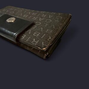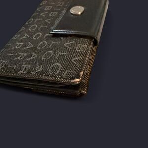monogram pattern, leather accents, snap closure, card slots, bill compartment, elegant design, logo medallion, durable canvas, sophisticated accessory, Italian craftsmanship