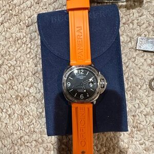 Elegant Panerai watch featuring a vibrant orange strap. Silver accents enhance the sleek design.