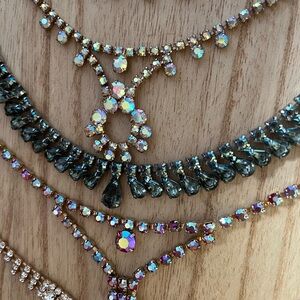 • Aurora Borealis Coating: Several necklaces feature that iconic iridescent finish developed by Swarovski in the 1950s, flashing with rainbow hues of pink, purple, green, and gold depending on the light.
