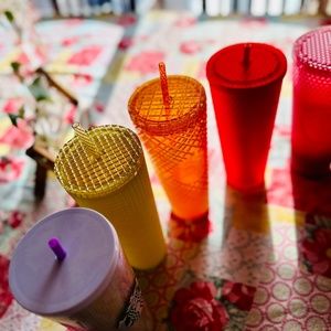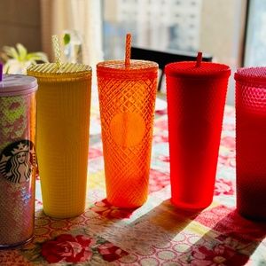 5 Large Starbucks cups used 1-2 times if that. There is 1- Mermaid, 1- Yellow, 1- Red, 1- Orange and 1 Pink Ombré.