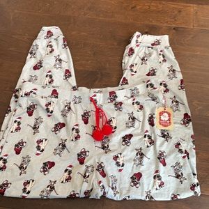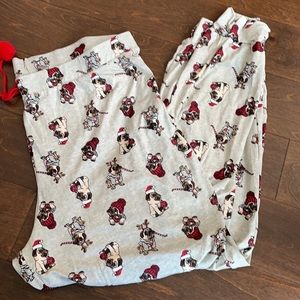 Very cute bulldog themed jogger style Christmas pajama pants the dogs are holding candy canes & ornaments. Elasticized waist & non functional drawstring with red Pom poms. 95% polyester 5% spandex