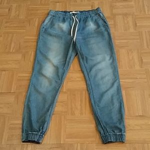 Bullhead Denim Co jeans in goid preowned condition, and features synched elastic ankles, 2 mock back pockets, 2 side pockets, and an elastic waist with a draw string.