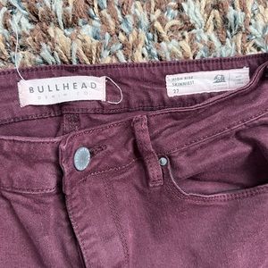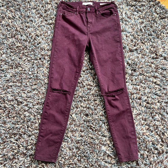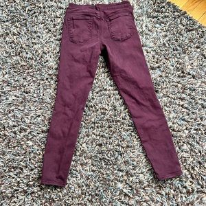 Excellent condition, length 27 inches, waist 28, high rise skinniest distressed jeans,maroon in color