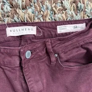 Excellent condition, length 27 inches, waist 28, high rise skinniest distressed jeans,maroon in color BUNDLE 2 ITEMS SAVE 15%