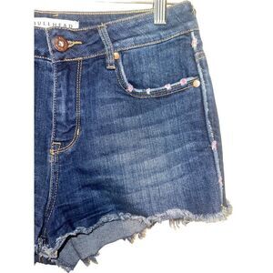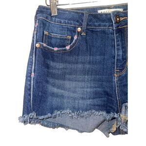 -Dark Wash with pink accents on pockets and sides of shorts.