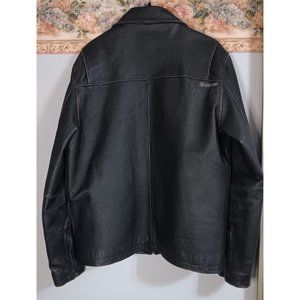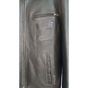 Full front zip closure. Chest pockets with zip closure. Open chest pocket. Front pockets. Fully quilted lined. Inner pocket. Zip cuffs, one pull tab is missing. 100% Genuine Leather shell. Polyester lining material. Chest 42". Length 26".