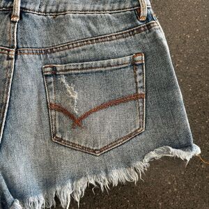 New without tags Bullhead Denim Co. high rise shorts in size 5. They are made of a light blue denim with distressed details and frayed hems. The shorts have a 13 1/2" waist, 10" rise, 9" inseam, and 11 1/2" leg opening. They have two front pockets, two back pockets, and a button and zipper closure.