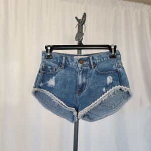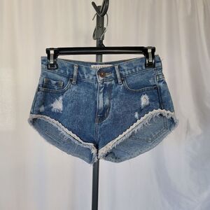 Bullhead juniors high rise Distressed denim shorts size 0 waist 24 to 26in. Rise 8