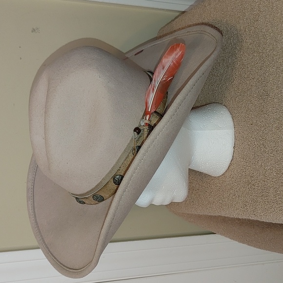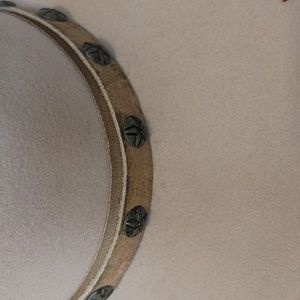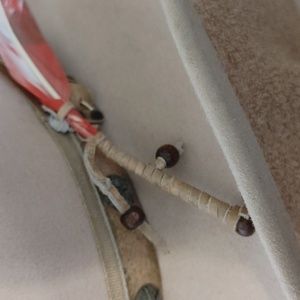 Studded strap; red feather and beads.
