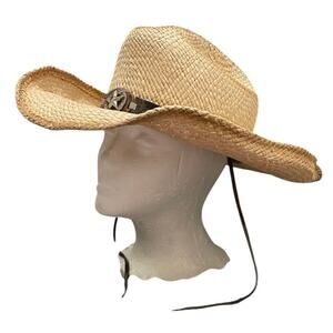 Genuine Panama straw with cattleman crease, 3" brim, burnished accents, and tooled hat band with silver-tone star detail. Chin cord with adjustable keeper. Memory wire brim can be reshaped. Excellent preowned condition, no flaws.