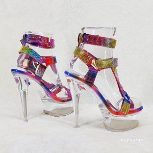 Bulls Rainbow Rhinestone Harness Strap Clear Platform Heels