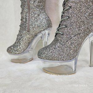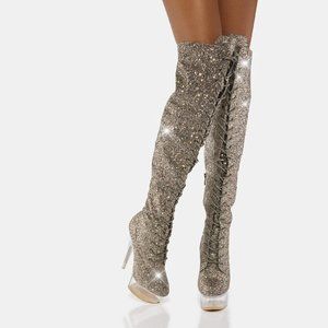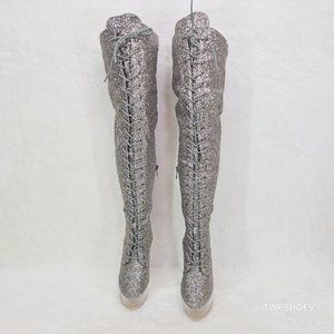 Bulls Silver Glitter Lace Up OTK Platform High Heel Thigh Boot