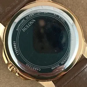 Vintage Bulova watch is elegantly understated, with a mother-of-pearl dial adorned by diamond accents that mark each hour. A two-tone White & Rose gold bezel, Sapphire Crystal. New Brown leather strap add to this exquisite timepiece. 8.25" New JB Champion Norwegian Calf Strap with Bulova Buckle and 1.25 inch Case. This dressy leather wrist watch from Bulova shows off a mother-of-pearl face & diamond dial. It's a classy look that takes you from the boardroom to after-five with ease. Bulova C4601200 MOP Crystal Accent Sapphire Crystal Preowned 98P119 B4 C4601200 Reg 17249801