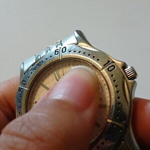 Needs a new battery. The wrist size is small at 5 1/4 inches. A jeweler should be able to add extra links to adjust the watch to your wrist size. There are scratches on the crystal, case, and band. There is a small nick on the crystal. It's a casual preppy style. Please view the photos. Thank you!