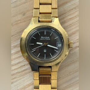 Description: Super rare vintage Accutron watch. Oval brown dial with gold and luminous hands and markers. Gold-tone bracelet and case. Just cleaned and serviced with a new battery installed. Works well!