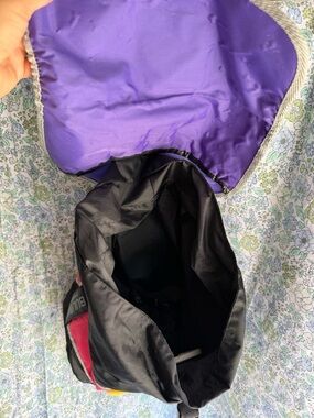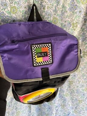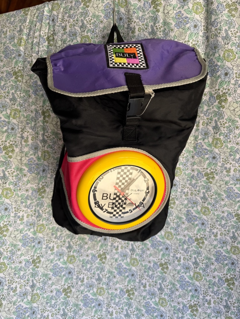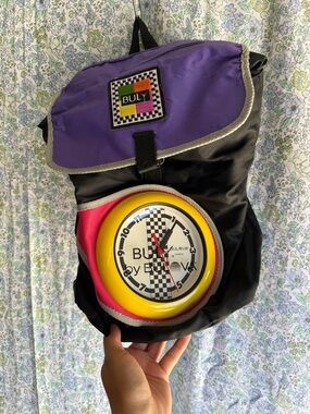 vintage 1988 Bulova branded backpack featuring an integrated quartz clock on the front