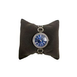 Crystal-encrusted ladies’ jewelry dress watch from the Bulova Crystal collection. Timepiece features a round silver tone stainless steel case and bracelet, contrasted by a striking blue, 3-hand face. The chain-link style bracelet features a jewelry clasp for a streamlined look and easy closure.