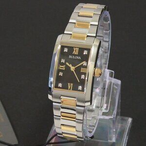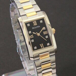 Fabulous ladies tank style watch from the Diamond Collection by Bulova. This beautiful two tone watch featured a black radiant dial, Roman numerals at 3, 6, 9 and 12 and the eight diamond indices for the rest. Its a two tone stainless case and bracelet with butterfly clasp. This elegant and easy to wear timepiece features a battery powered quartz movement. Fits wrist sizes up to 7 1/2”, is new in box and works as it should.