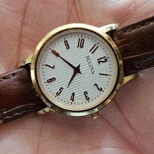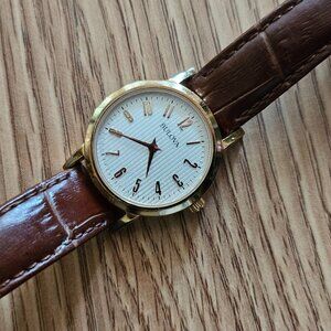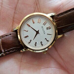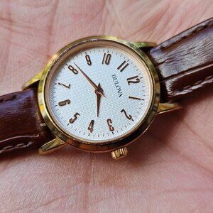 Bulova Girls Wristwatch Gold Tone case Analog Quartz Watch Brown Leather Strap