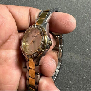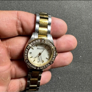 Bulova Ladies Quartz Watch Mother-of-Pearl Dial 22 Diamonds Gold & Silver Tone working with new battery shows signs of wear such as scratches on case band and crystal as well as tarnishing/discoloration see pictures for reference