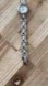 Description: Beautiful round pearl dial with stainless hands and markers. Stainless steel weave bracelet. Just cleaned and serviced with new battery installed. Works well!
