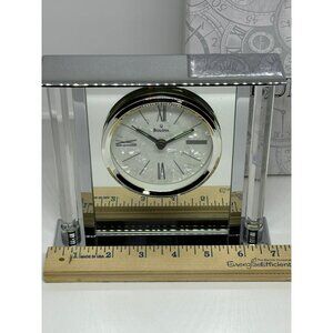 Bulova mantel clock, model B2454, with silver-tone frame, pearl face, and beveled glass side panels. Measures 6.75"x6".untested — for parts or repair.
