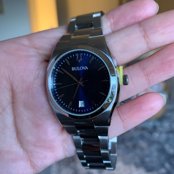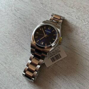 Men’s Bulova watch with a blue face. Tags still on, Bulova box included.