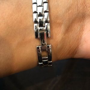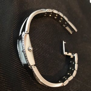 Bulova mother of pearl faced watch with diamond accents. Has a clasp closure. Stainless steel. When fully open 6” in length. Needs new battery.