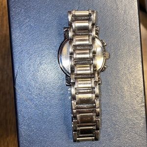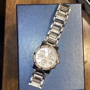 Gently used stainless steel and diamond watch with white face and hands water resistant