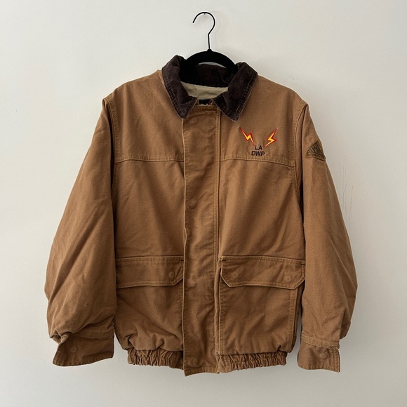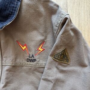 Bulwark protective wear LA DWP embroidered jacket! Extremely cool workwear style jacket embroidered with LA DWP (Los Angeles Department of Water and Power). There are red paint marks on a few spots (see photographs) and there is general wear but no holes, tears, rips, etc. It's in good condition. The collar is corduroy material, the closure has a heavy duty zipper and heavy duty snaps, and the waist is elastic and stretchy. Size small!