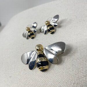 This charming silver-tone bumblebee brooch and earrings set adds a whimsical touch to any outfit. With mixed metals and intricate detailing, it's the perfect novelty accessory for insect enthusiasts and fashion lovers alike.