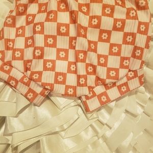 Infant girl bummies in size 9 to 12 month. Soft rib knit two stretch. Burnt orange block design background color cream. High waisted bloomers with banded legs.