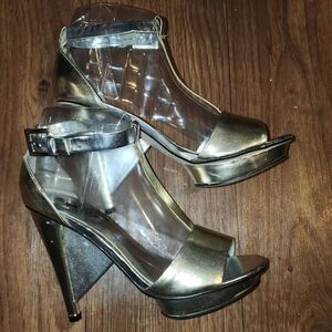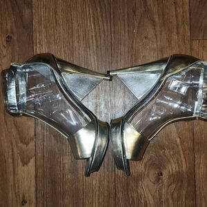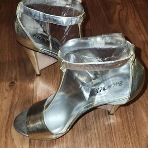Uniquely beautiful metallic platform sandals ankle strap with buckle. Apx 5"