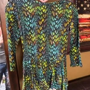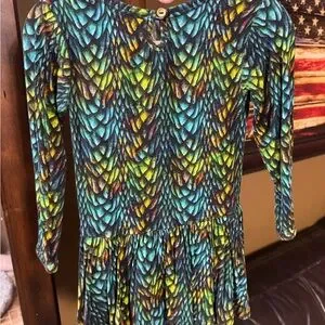 Vibrant dress with a scale pattern. Features shades of green, blue, and yellow. We love this dress! We did wear multiple times and there’s a small pinhole near the snaps. I posted a picture. It can be easily fixed, but I lowered the price because of it. It does have the faded black that appears on all bamboo even if washed cold and hung dry.