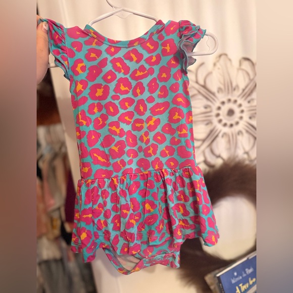 Sweet turquoise twirl romper with bright pink and yellow leopard spots. Soft, stretch fabric with flutter sleeves and a ruffle skirt for easy movement. Snap closures for quick changes. Vibrant turquoise and pink design perfect for everyday play. We worn once no stains/ pinholes