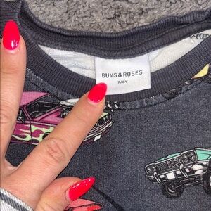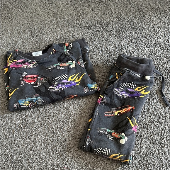 This is a Bums & Roses Hot Wheels "Fast Track" black pajama pant set made of bamboo-viscose blend fabric. Size 7/8. Smoke free pet free home. Washed in free and clear detergent and only ever hung dry.