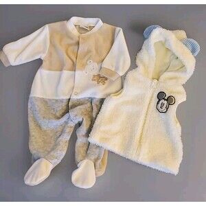 This lot includes a Disney Baby Mickey Mouse hooded vest with blue ears and a Just Too Cute long-sleeve onesie in a cotton with a multicolor print. The jacket features a sleeveless fleece vest style with zip, while the onesie has snap buttons for easy wear. Both items are machine washable and suitable for travel, activewear, or casual occasions, perfect for boys aged 0-3 months in winter, fall, or spring.
